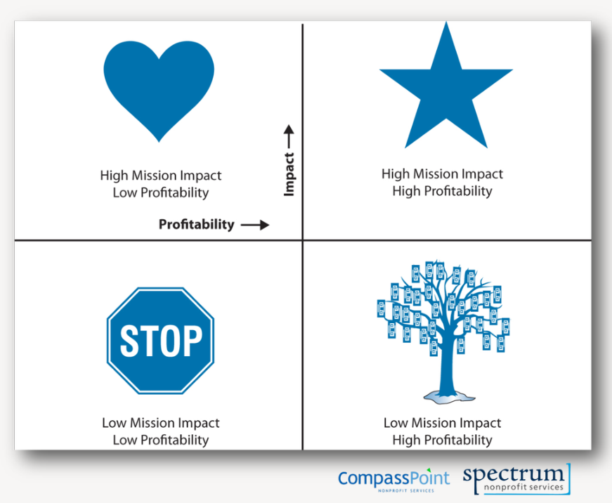 Upper right quadrant – Stars: programs, projects, and initiatives to invest in and grow. They generate net revenue for the operations and have meaningful mission impact.